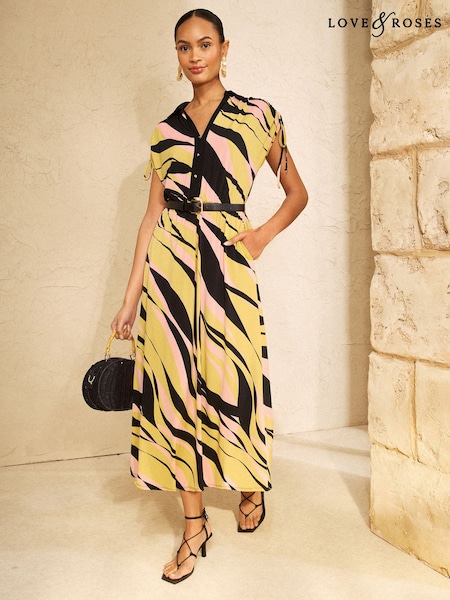 Love & Roses Lime Green Zebra Print Jersey Ruched Shoulder Belted Midi Dress