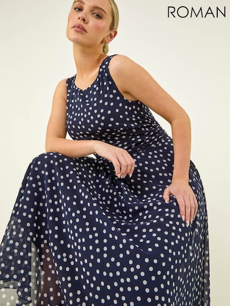 Roman Blue Spot Print Chiffon Pleated Midi Dress