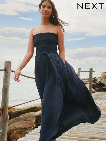 Blue Gingham Bandeau Shirred Body Midi Dress