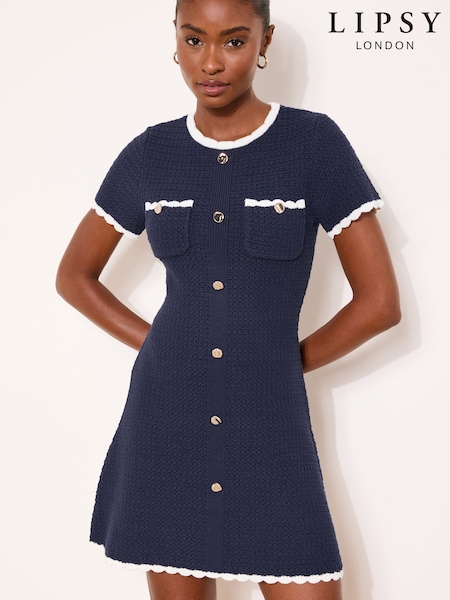 Lipsy Navy Blue Tipped Textured Knitted Short Sleeve Mini Dress