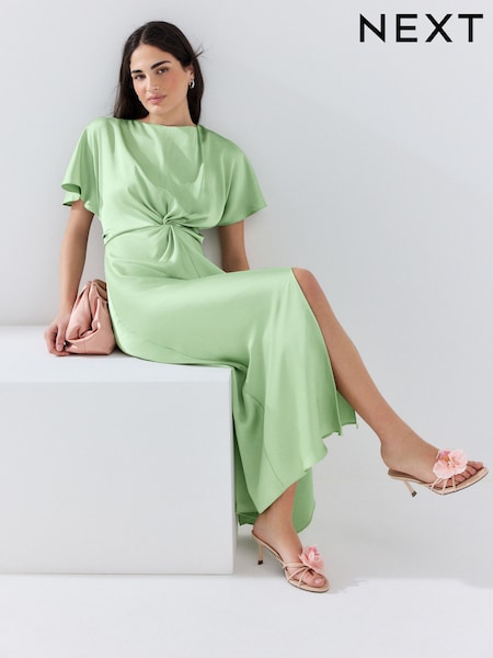 Sage Green Textured Satin Short Sleeve Twist Front Midi Dress