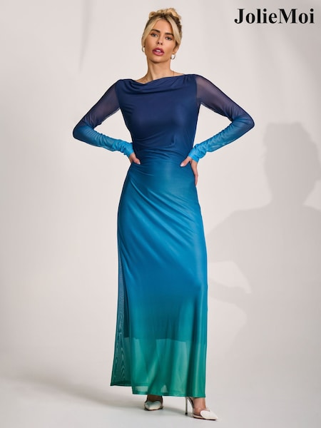Jolie Moi Green Ombre Long Sleeve Slash Neck Mesh Maxi Dress