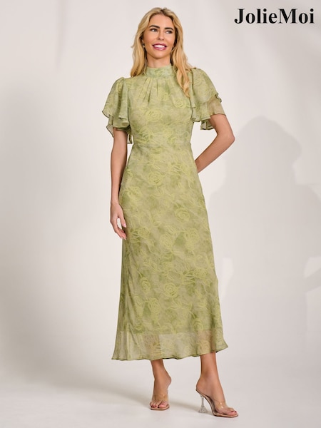Jolie Moi Green High Neck Angel Sleeve Chiffon Maxi Dress