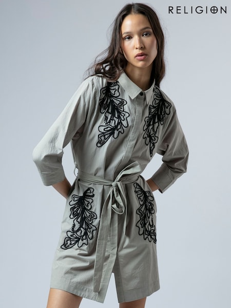 Religion Grey Tory Button Through Kaftan Dress With Tie Waist Belt And Frill Detailing