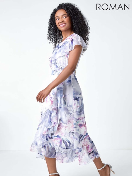 Jolie Moi Grey Ruffle Sleeve Print Satin Maxi Dress