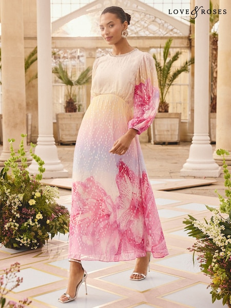 Love & Roses Floral Metallic Embellished Neck Long Sleeve Midi Dress