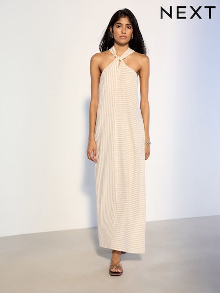 Neutral Stripe Halter Twist Neck Midi Dress