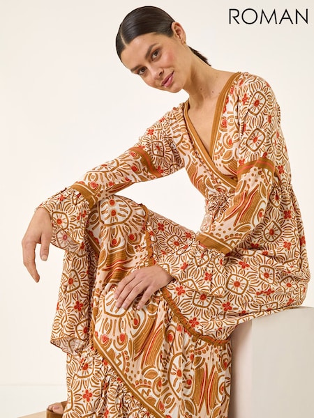 Roman Orange Wrap Bodice Tie Waist Midi Dress