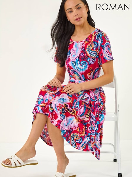 Roman Red Floral Tiered Tie Waist Midi Dress