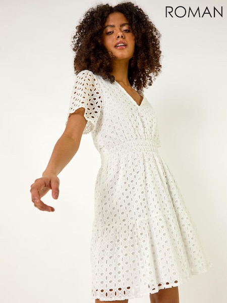 Roman White Broderie Anglaise Tiered Dress