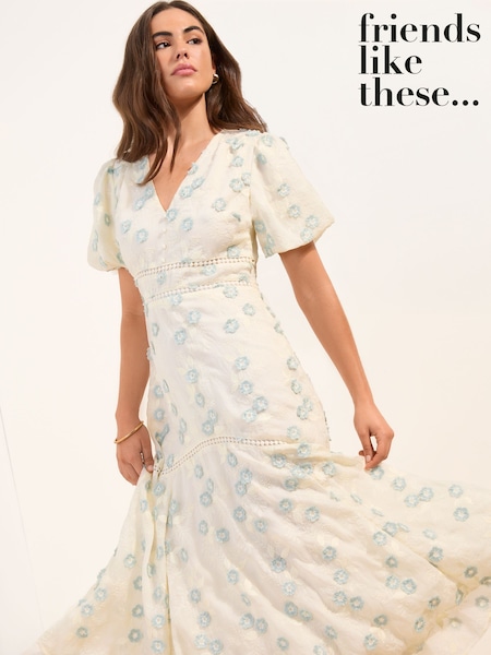Friends Like These White Puff Sleeve Floral Detail Midi Dress