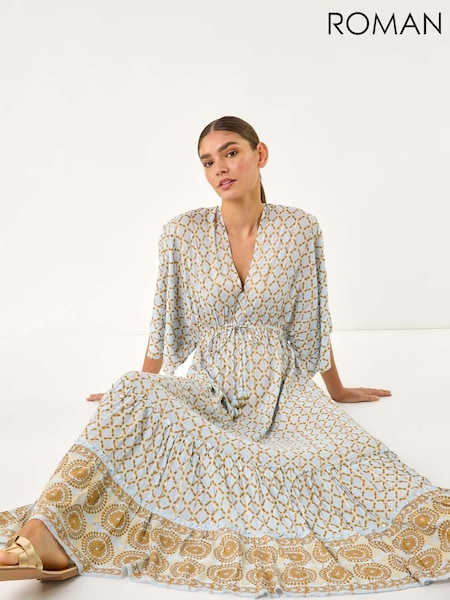 Roman Blue Shimmer Boho Border Maxi Dress