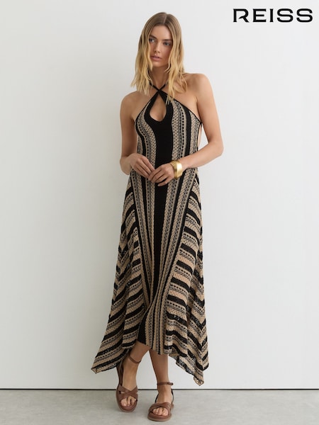 Reiss Black/Neutral Annie Stripe Crochet-Knit Tie-Back Maxi Dress
