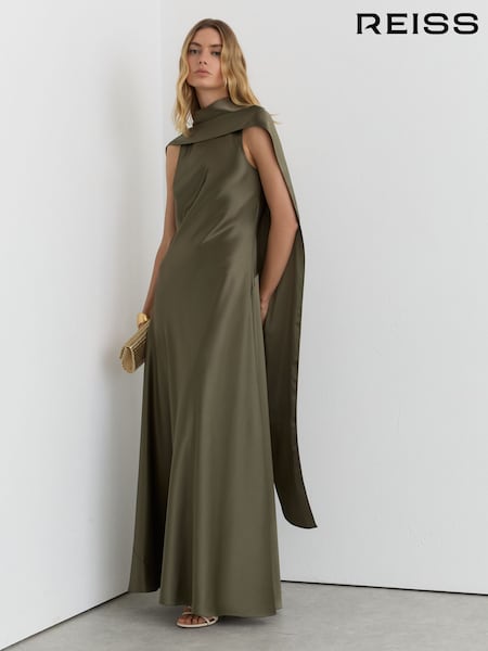 Reiss Khaki Green Fae Petite Satin Cape Maxi Dress