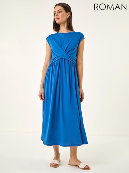Roman Blue Cross-Over Front Stretch Midi Dress