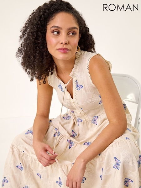 Roman White Butterfly Print Tiered Midi Dress
