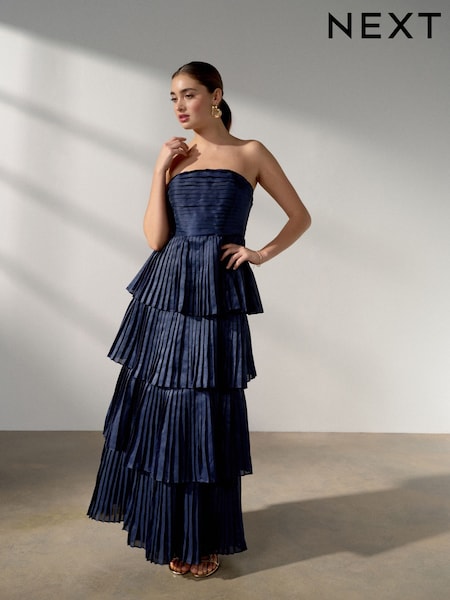 Navy Blue Bandeau Pleated Maxi Occasion Dress
