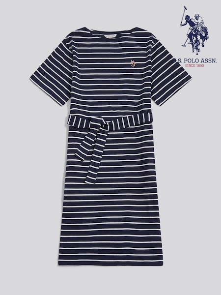 U.S. Polo Assn. Blue Stripe Belted Boat Neck Midi Dress