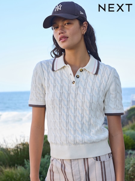 Ecru Tipped Short Sleeve Cotton Cable Knit Polo Top