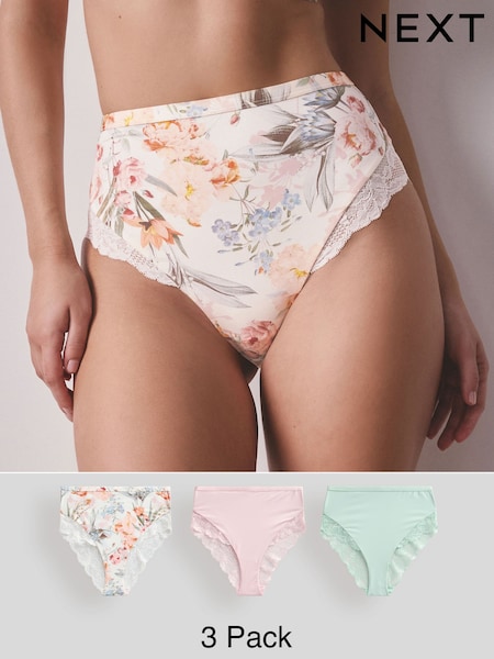Cream Floral/Green/Pink High Rise High Leg Microfibre & Lace High Waist Knickers 3 Pack