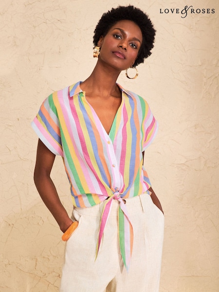 Love & Roses Multi Stripe Tie Front Roll Sleeve Shirt