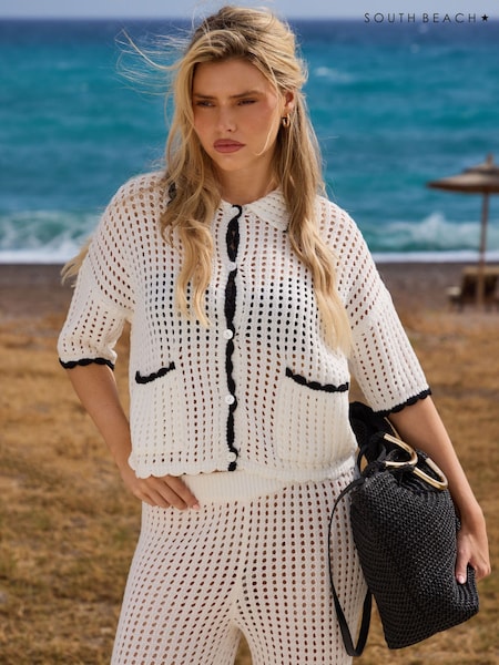 South Beach Cream Crochet Short Sleeve Beach Shirt