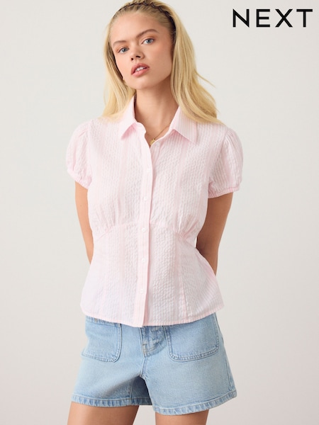 Pink/White Stripe Short Sleeve Button Front Top