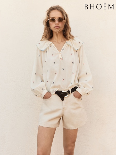 BHOEM Ecru High Rise Contrast Stitch Denim Shorts