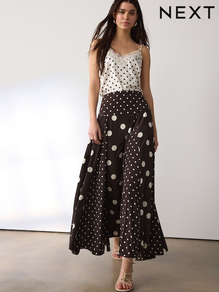 Chocolate Brown Spliced Spot Drop Waist Midi Skirt