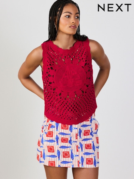 Red/Blue Fish Print Linen Rich Mini Skirt