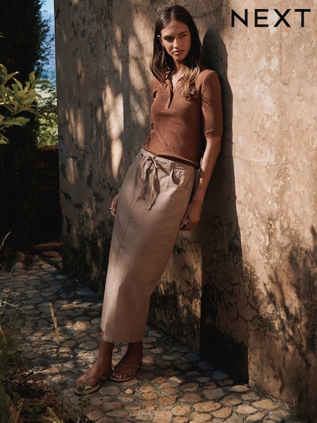 Stone Cotton Linen Blend Midi Skirt