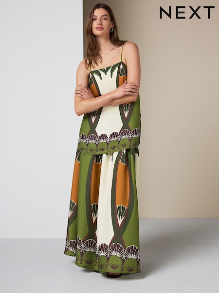 Ecru/Brown Print Satin Pleated Maxi Skirt