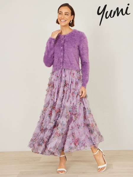Yumi Purple Floral Ruffle Mesh Midi Skirt