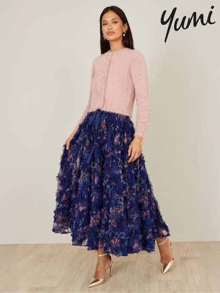 Yumi Blue Floral Ruffle Mesh Midi Skirt
