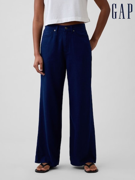 Gap Blue Mid Rise Linen-Blend Wide-Leg Trousers