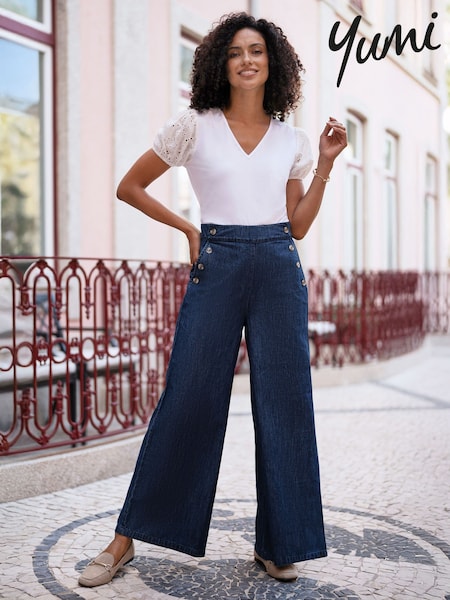 Yumi Blue Chambray Wide Leg Trousers With Button Details