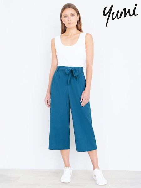 Yumi Blue Linen Mix Cropped Trousers With Tie Belt