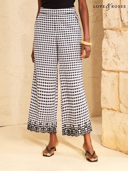 Love & Roses Black Gingham Embroidered Scallop Trim Wide Leg Trousers