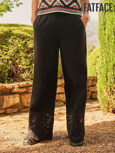 FatFace Amberly Black Embroidered Wide Leg Trousers