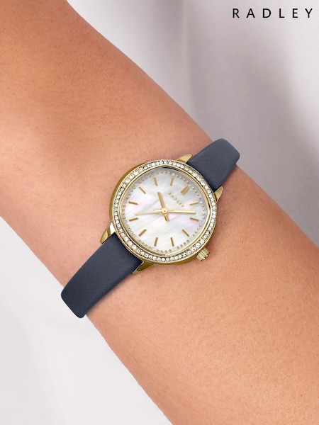 Radley Blue Pale Gold Plated Stone Set Case Mother Of Pearl Dial Ink Leather Strap Watch
