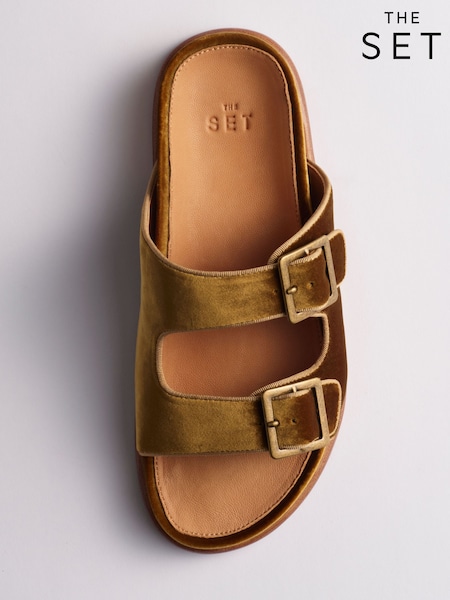 The Set Velvet Double Strap Slip On Footbed Sandals Olive Green