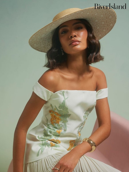 River Island Brown Edwina Oversized Embroidered Boater Hat