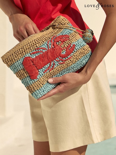 Love & Roses Light Blue Lobster Embroidered Raffia Clutch Bag