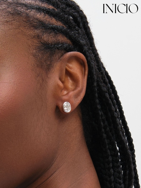 Inicio Silver Tone Oval Cubic Zirconia Bezel Studs Gift Pouch