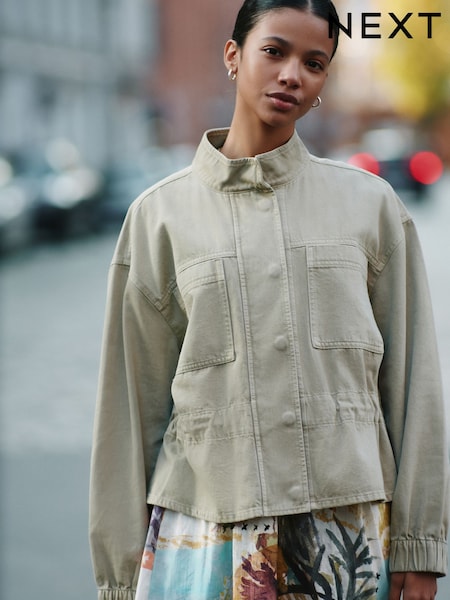 Khaki Green Denim Funnel Neck Zip Through Drawstring Jacket