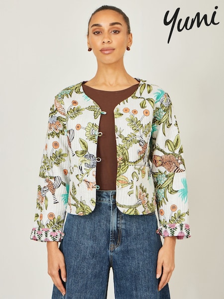 Yumi White Printed Reversible Cotton Quilted Jacket