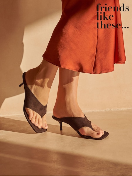 Friends Like These Chocolate Brown Faux Suede Toe Thong Mid Stiletto Heel Mule Sandals