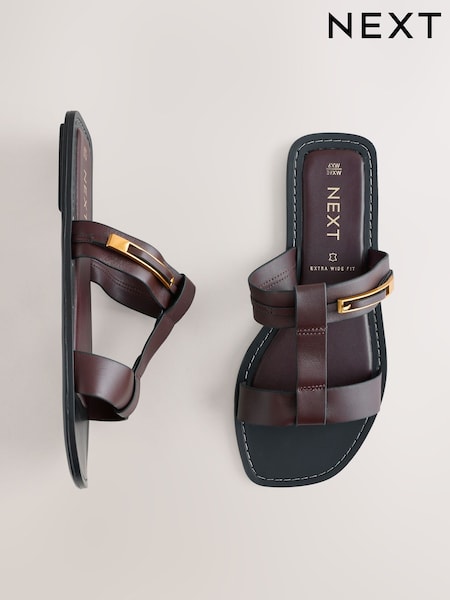 Chocolate Brown Leather Extra Wide Fit Buckle Trim Sandals