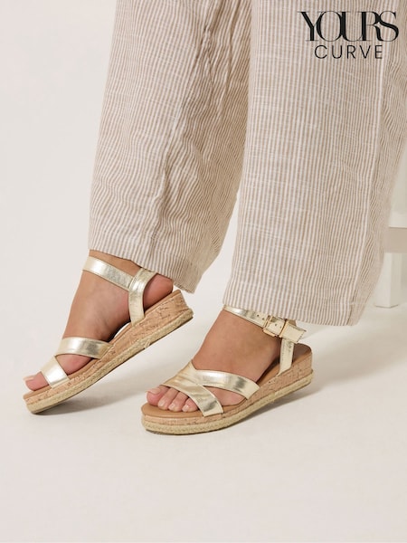 Yours Curve Gold Wide Fit V Cut Plaited Wedge Sandals