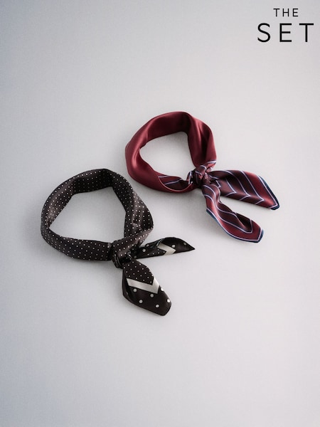 The Set 2 Pack Satin Neck Scarfs Brown Spot/ Red Stripe